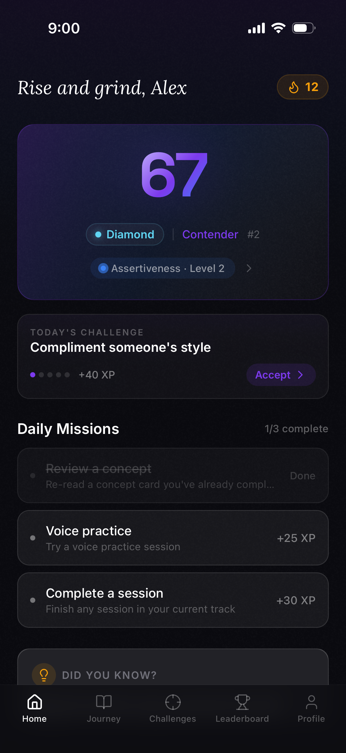 Daily missions. Voice practice. Real conversations. The gap between your score and 100 starts shrinking — and you'll feel it before you see it.